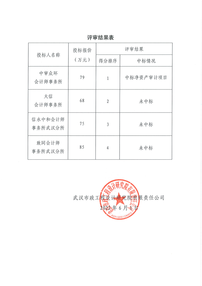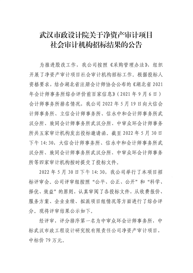武漢市政設計院關于凈資產審計項目社會審計機構招標結果的公告
