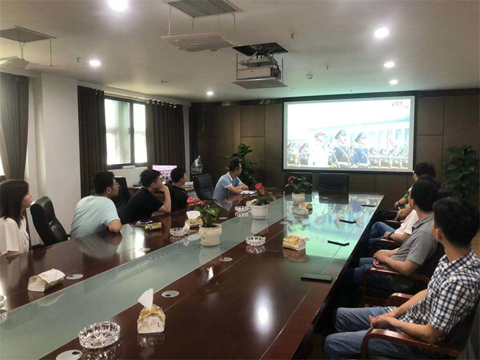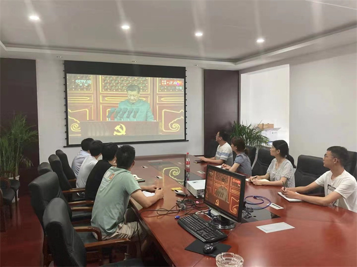 公司領導、總經理助理、駐總院辦公的部門負責人、支部書記在西四樓會議室集中收看大會盛況。大會伊始,在轟鳴的禮炮聲中,國旗護衛隊護衛國旗颯爽登場;全場肅立高唱《國歌》,高亢的旋律瞬間營造了莊嚴肅穆的氛圍;少先隊員和共青團聯合獻詞,回顧黨的光輝歷史,表達對黨的熱愛與忠誠。大會現場氣氛莊嚴,激昂奮進,讓收看的人仿佛置身現場,親臨盛典。