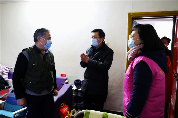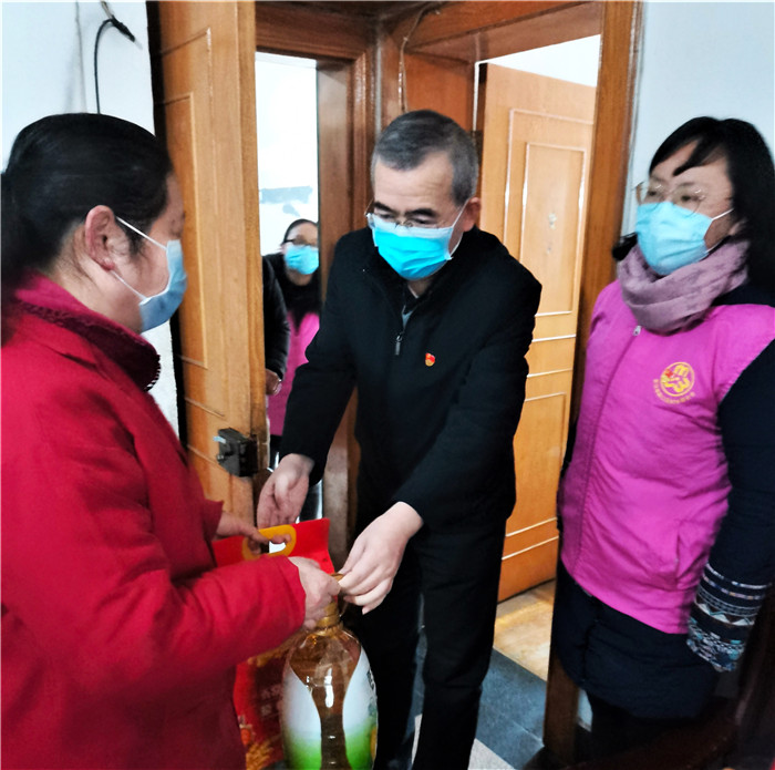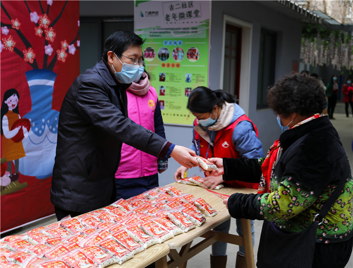 慰問期間,恰逢社區(qū)正在開展“臘八送福·甜蜜相伴”活動(dòng),談逢陽(yáng)一行也加入其中,熱情地為前來的社區(qū)居民發(fā)放臘八米,送上殷切的節(jié)日祝福,叮囑他們要做好防護(hù)。